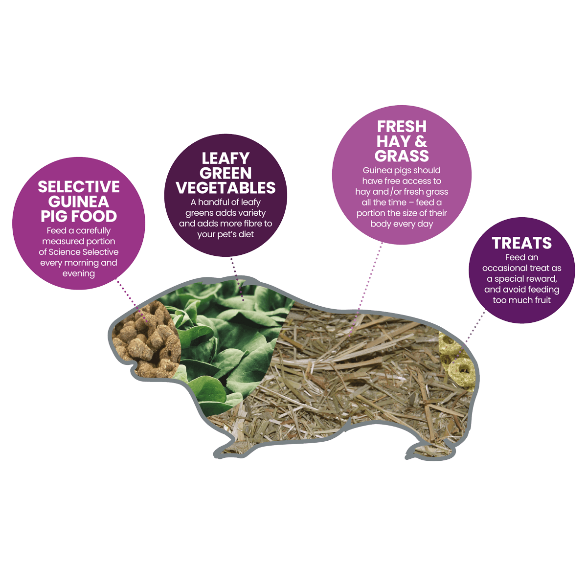De gemiddelde volwassen cavia heeft 40-50g per dag Selective Guinea Pig Botanicals nodig. Er moeten ook verse groenten worden verstrekt, samen met hooi van goede kwaliteit en schoon drinkwater. Koel en droog bewaren.